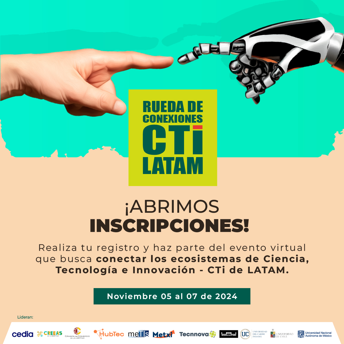 "Llegó la hora de asegurar tu cupo en la Rueda de Conexiones CTi LATAM 2024, el evento virtual que conecta los Ecosistema de Ciencia, Tecnología e Innovación de Latinoamérica para promover las capacidades de los grupos de investigación y generar relaciones de confianza y cooperación entre países. Ingresa a www.ruedactilatam.com, conoce más del evento y realiza tu registro. ¡No te pierdas esta oportunidad única de conectar con la comunidad CTi en Latinoamérica! Noviembre 05 al 07 de 2024 #RuedaCTiLATAM2024 #ElCaminoHaciaElFuturo #Conexiones #EcosistemaCTi"